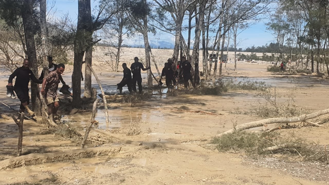 Personel Kompi 4 Batalyon D Pelopor Satbrimob Polda Papua Bantu Dirikan Tenda Darurat untuk Warga Terdampak Longsor di Distrik Asotipo