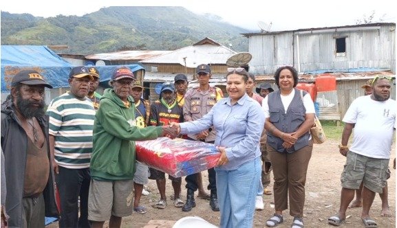 Sat Binmas Polres Tolikara Dampingi Dinas Sosial Salurkan Bantuan Pangan untuk Korban Kebakaran di Karubaga