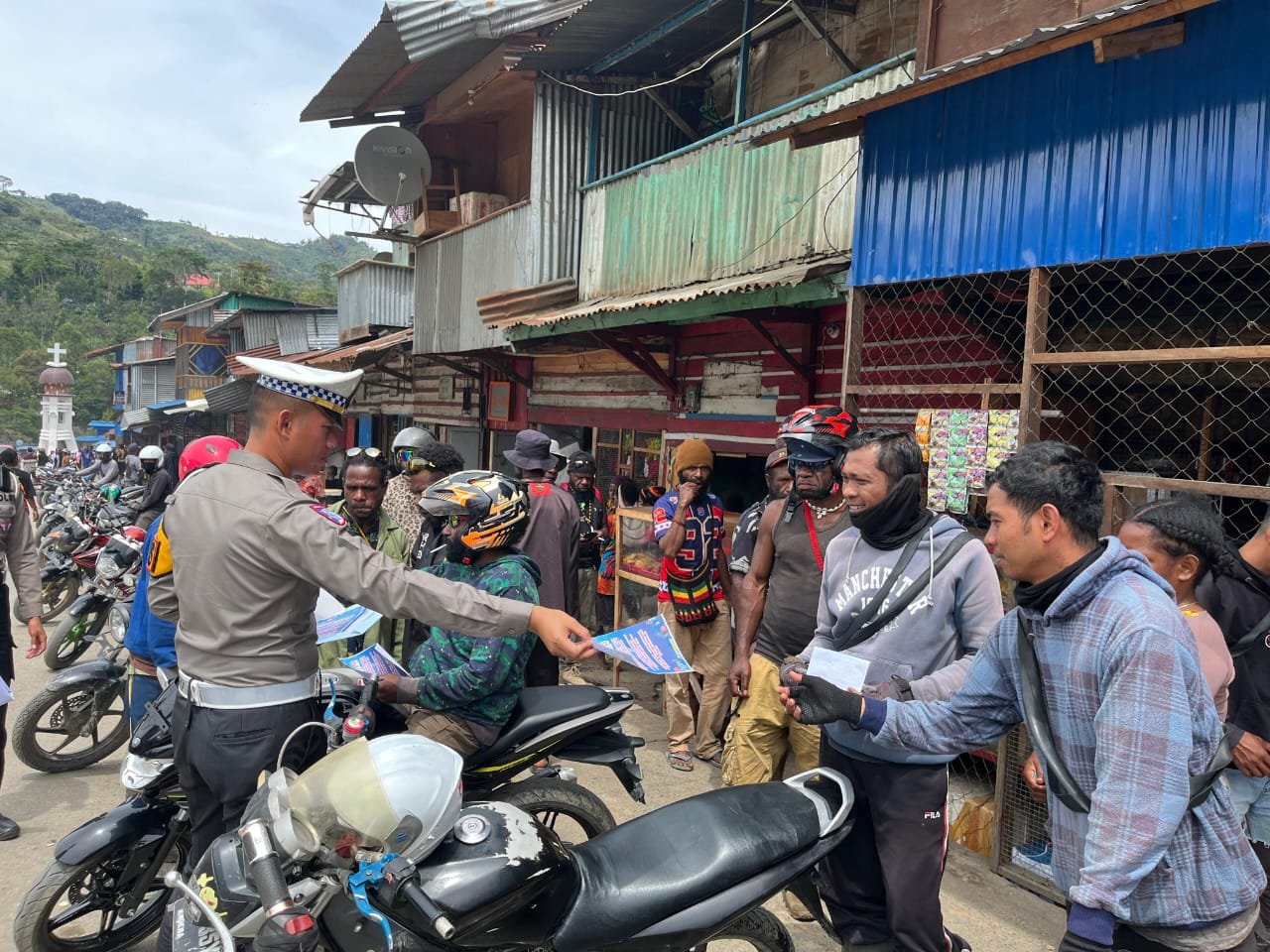 Papua – Memasuki hari pertama pelaksanaan Operasi Zebra Cartenz 2025, Satuan Lalu Lintas Polres Tolikara melaksanakan kegiatan sosialisasi keselamatan berlalu lintas di lima lokasi pangkalan ojek di Kota Karubaga, Senin (17/11/2025).