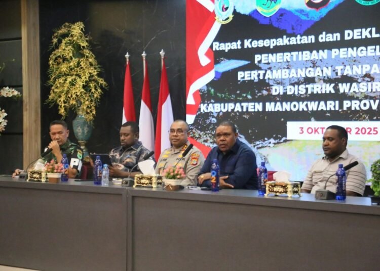 Papua Barat – Kepolisian Daerah Papua Barat menunjukkan keseriusan dalam menangani aktivitas Pertambangan Tanpa Izin (PETI) yang marak terjadi di Distrik Wasirawi, Kabupaten Manokwari. Langkah konkret itu diwujudkan melalui kehadiran Kapolda Papua Barat Irjen Pol Johnny Eddizon Isir, S.I.K., M.T.C.P., pada Rapat Kesepakatan dan Deklarasi Bersama Penertiban Pengelolaan Pertambangan Tanpa Izin (PETI) yang berlangsung di Aula Sasana Karya, Kantor Bupati Manokwari, Jumat (3/10/2025).