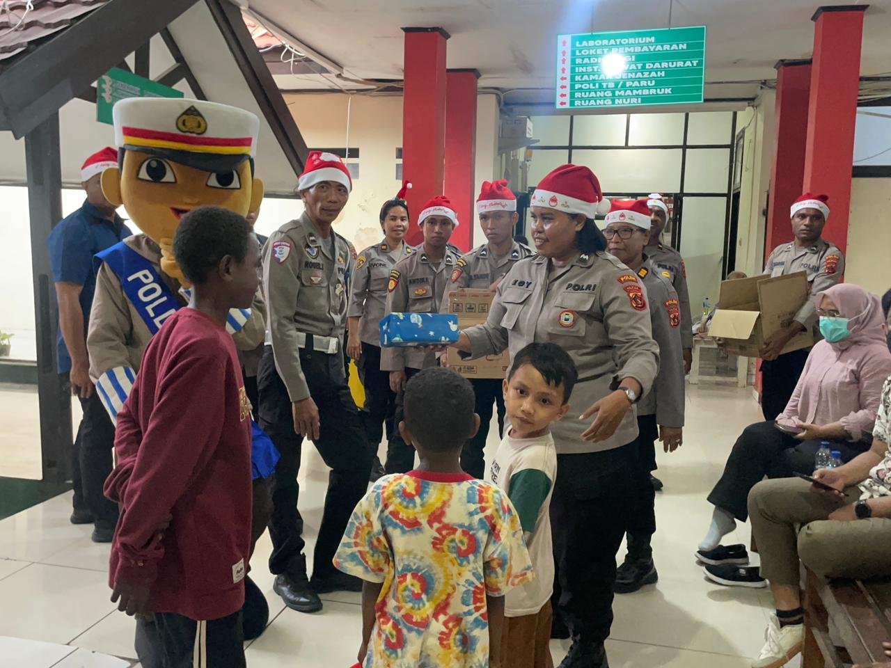 Rombongan kemudian menuju ruang perawatan anak di Rumah Sakit Bhayangkara. Dengan penuh empati, personel Polda Papua membagikan kurang lebih 25 kado Natal kepada anak-anak yang sedang menjalani perawatan, serta anak-anak di sekitar lingkungan rumah sakit.