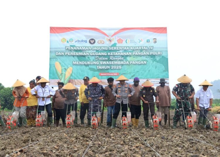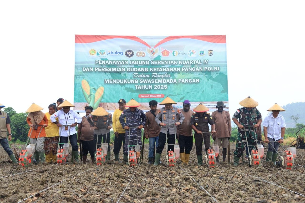 Papua – Polda Papua melalui jajaran melaksanakan kegiatan Penanaman Jagung Serentak Kuartal IV dan Peresmian Operasional Gudang Penyimpanan Jagung Slog Polri sebagai bagian dari program nasional Swasembada Pangan Tahun 2025, bertempat di lahan PTPN, Jalan Poros Arso 6 – Arso 1, Kampung Sanggaria, Kabupaten Keerom, Rabu (08/10).