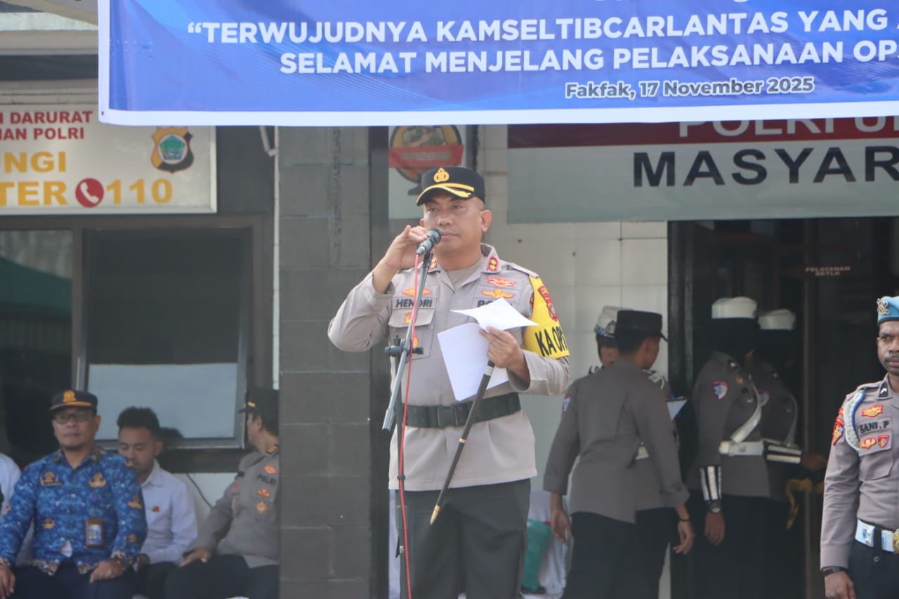 Fakfak – Polres Fakfak menggelar Apel Gelar Pasukan Operasi Zebra Mansinam 2025 dalam rangka menciptakan keamanan, keselamatan, ketertiban dan kelancaran lalu lintas (Kamseltibcarlantas) menjelang pelaksanaan Operasi Lilin 2025, Rabu (17/11) di halaman Mapolres Fakfak, Jalan Thumburini No.1.
