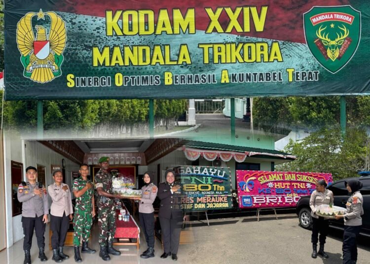 Papua – Kepolisian Resor (Polres) Merauke menunjukkan sinergi dan soliditas yang kuat bersama Tentara Nasional Indonesia (TNI) melalui kegiatan penyerahan tumpeng secara simbolis dalam rangka memperingati Hari Ulang Tahun (HUT) ke-80 TNI, bertempat di Markas Komando Daerah (Makodam) XXIV/Mandala Trikora, Distrik Tanah Miring, Kabupaten Merauke, Minggu (5/10/2025).