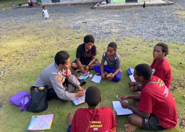 Papua – Dalam rangka mendukung peningkatan kualitas pendidikan masyarakat di wilayah binaan, Satuan Tugas Polisi Sahabat Anak Papua (Si-Ipar) Operasi Rasaka Cartenz 2025 Polres Jayapura kembali melaksanakan kegiatan pembelajaran bagi anak-anak dan mama-mama di Kompleks Bahtera Hebron, Kampung Doyo Baru, Distrik Waibu, Kabupaten Jayapura, Rabu (15/10/2025).