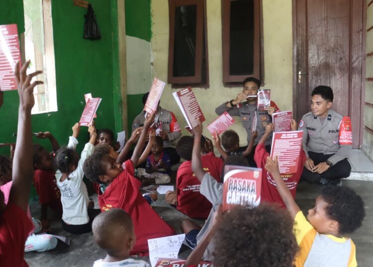 Papua – Suasana hangat dan penuh semangat menyelimuti Kompleks Jalan Sosial, Distrik Dekai, Kabupaten Yahukimo, saat personel Subsatgas Si-Ipar Polres Yahukimo melaksanakan kegiatan edukatif dalam rangka Operasi Rasaka Cartenz 2025, Selasa (14/10).