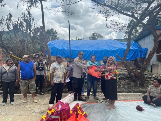 Polres Tolikara dan Dinsos Salurkan Bantuan Sembako bagi Korban Kebakaran di Karubaga